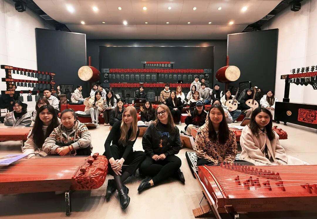 音乐学院的器乐教室里,两位外籍学子尝试轻拨筝弦,体验古筝雅乐,在清越音声中触摸传统民乐的韵律意境。