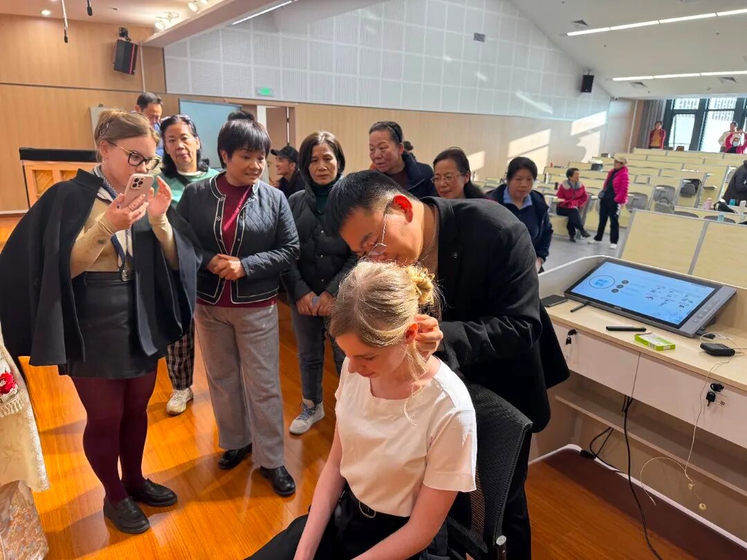 护理学院的中医讲堂上,在夏西超院长和明虎斌的专业指导下,两位俄罗斯学生专注地了解中医理论,亲身体验针灸、推拿的独特魅力,感受传统医学的博大精深。